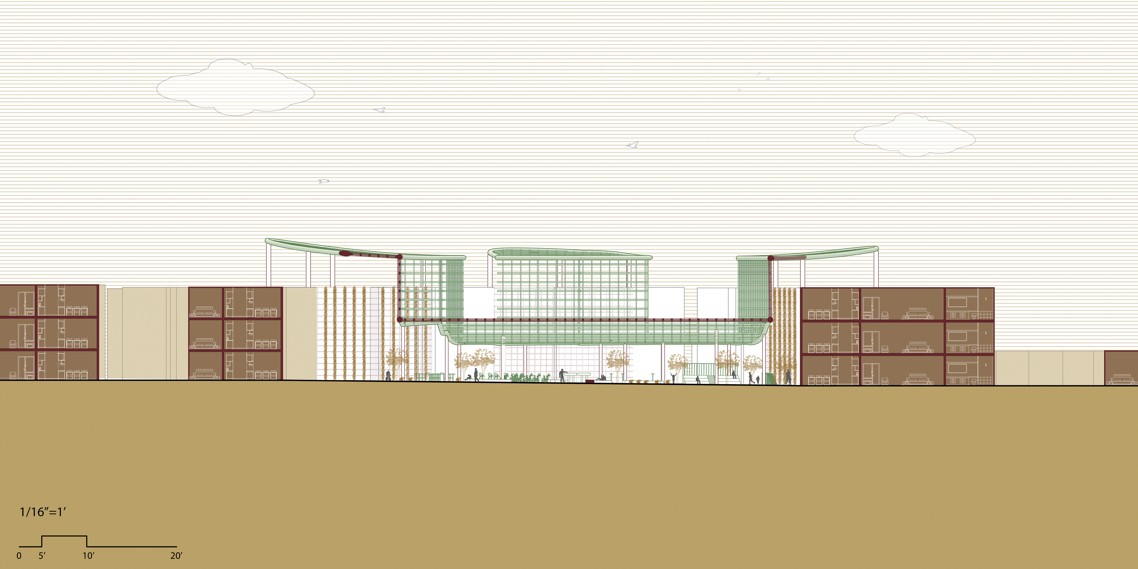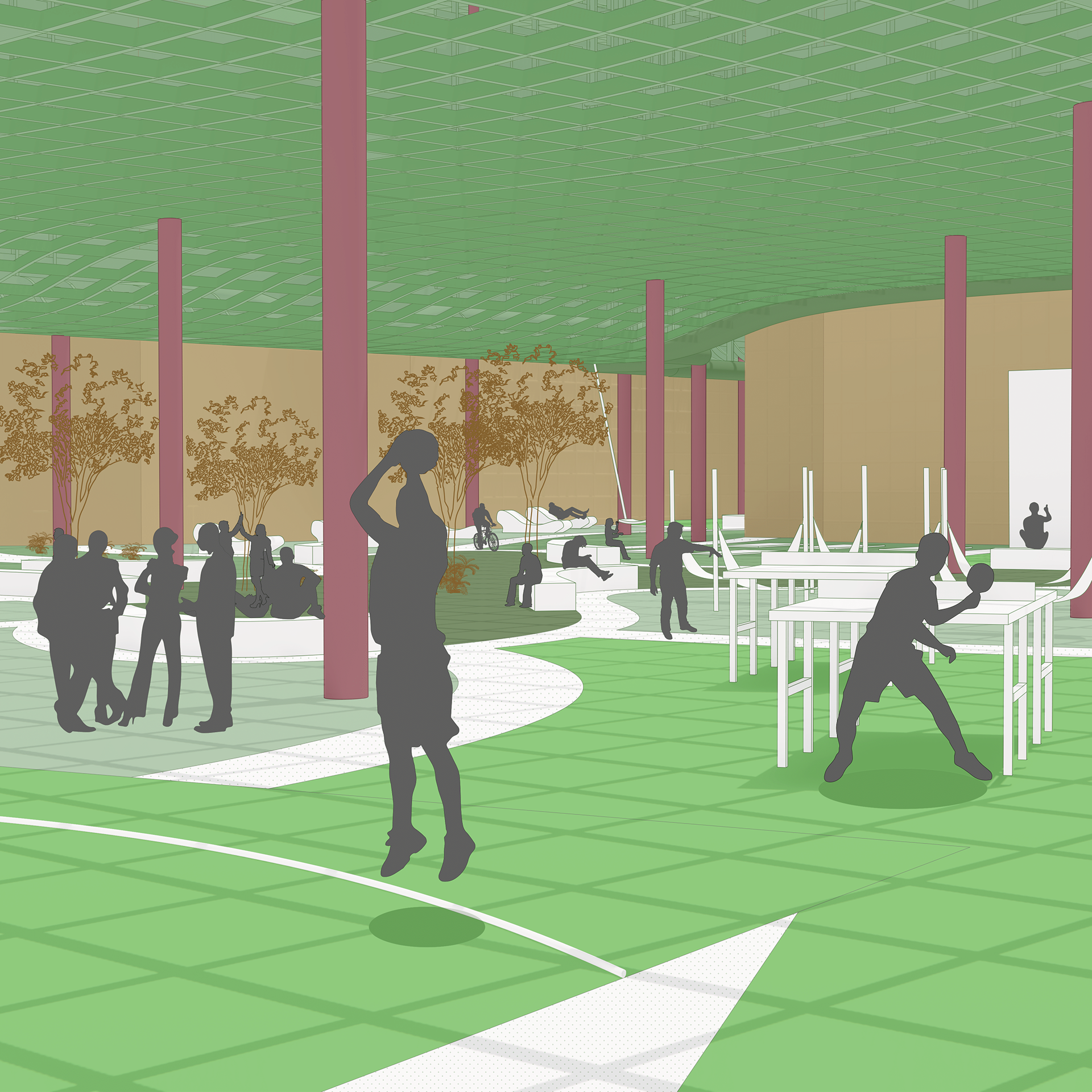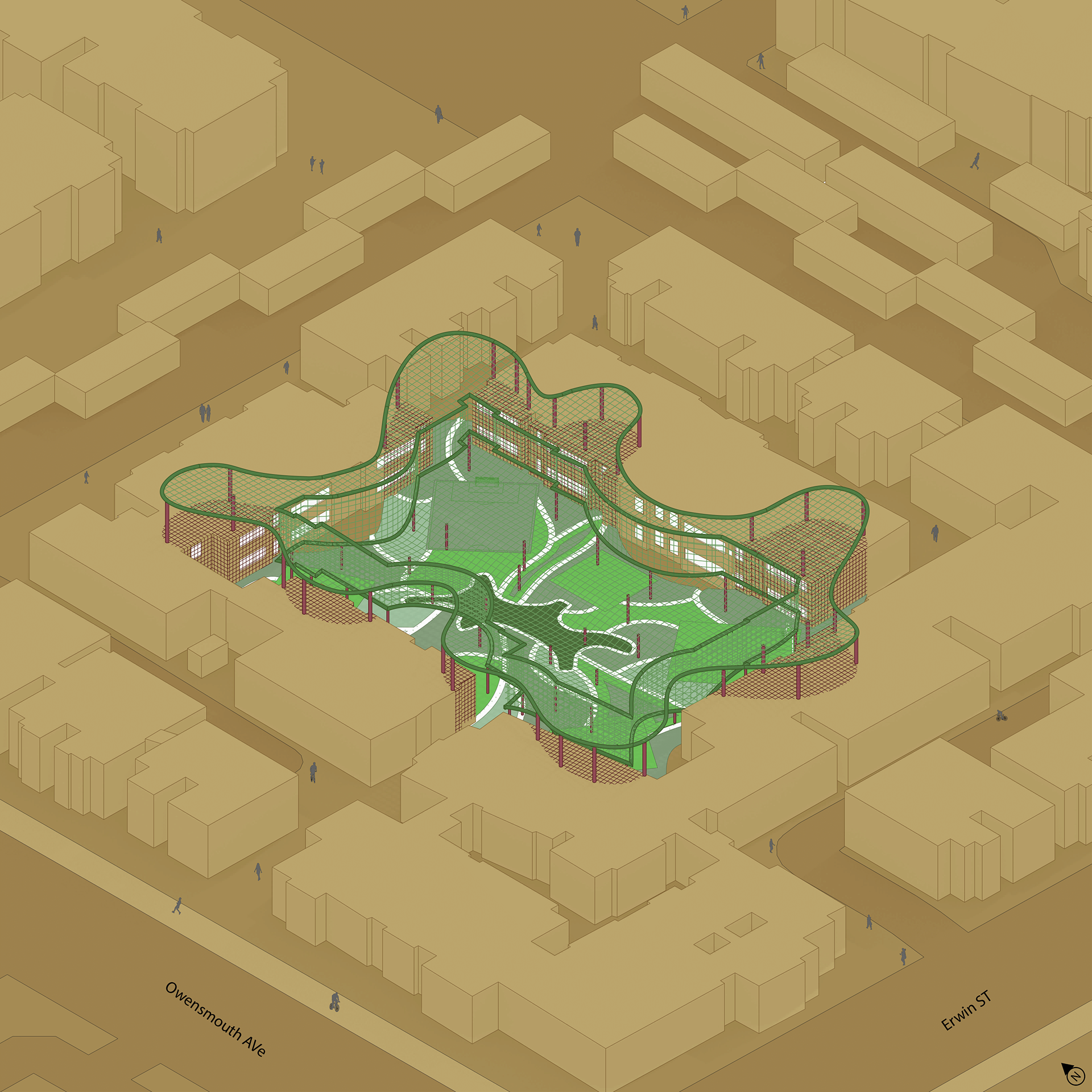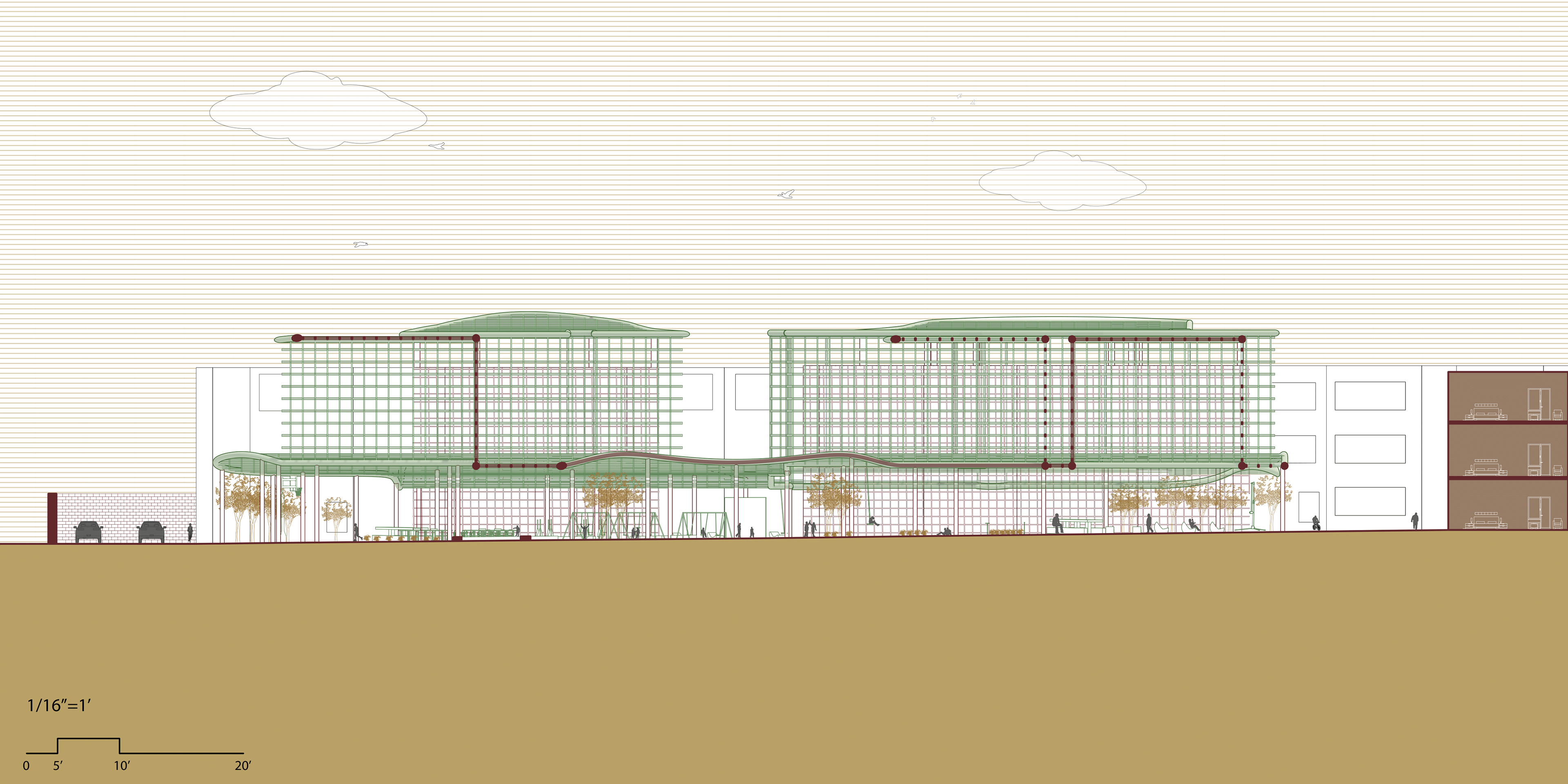 This intervention proposes an additive structure for existing low-income housing complexes in the West Valley that lack shaded and communal outdoor areas. The new form "collides" with the existing apartment building, molding itself around the architecture to create shaded zones and spaces for recreation, rest, and interaction. Through this approach, the project not only provides functional environmental improvements but also reimagines the role of architectural playfulness in enhancing everyday living.