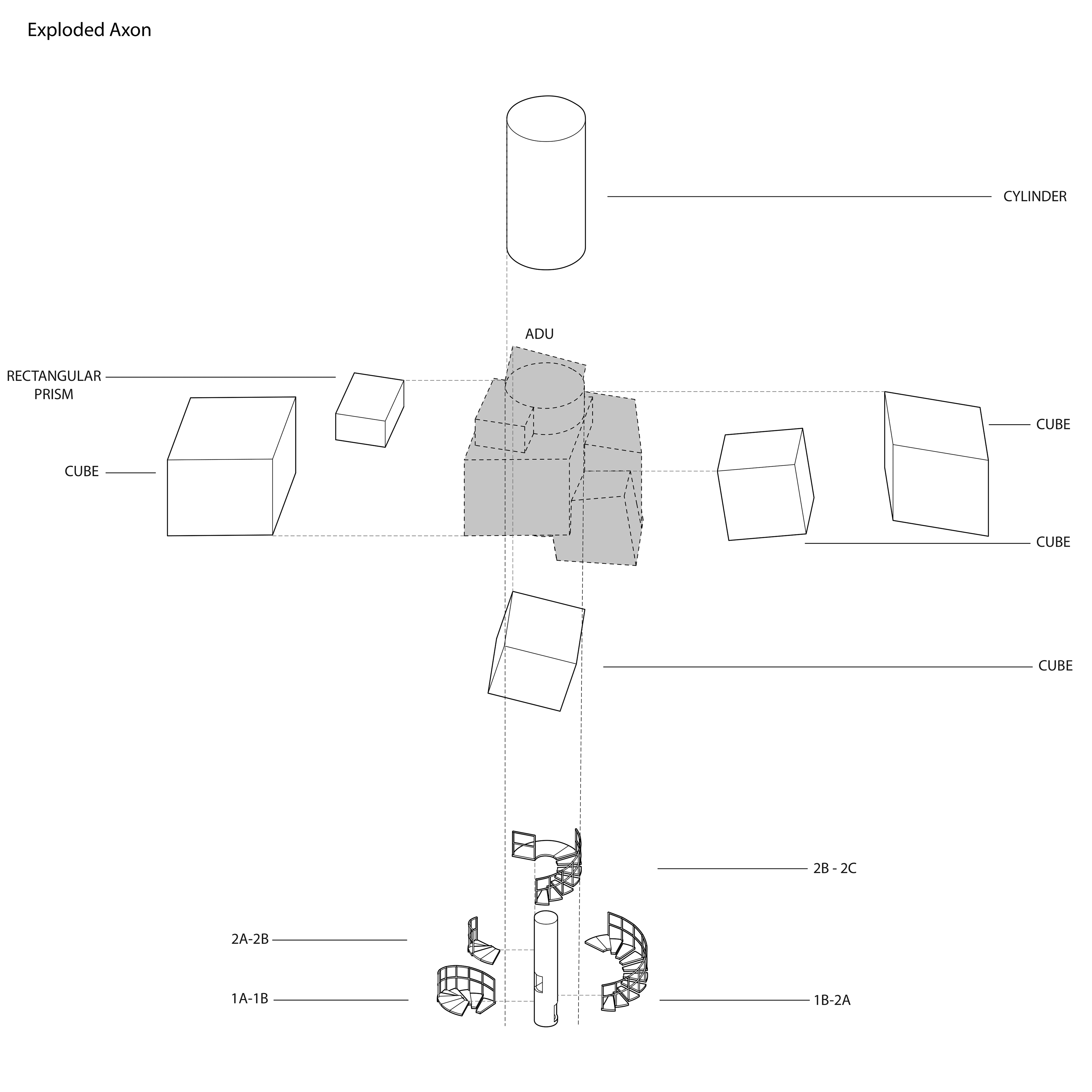 This project explores the intersection of geometric abstraction and residential design through an Accessory Dwelling Unit (ADU) inspired by John Hejduk’s Diamond House. Using an additive design approach, the project assembles a series of distinct geometric volumes to create a sculptural yet functional living space.