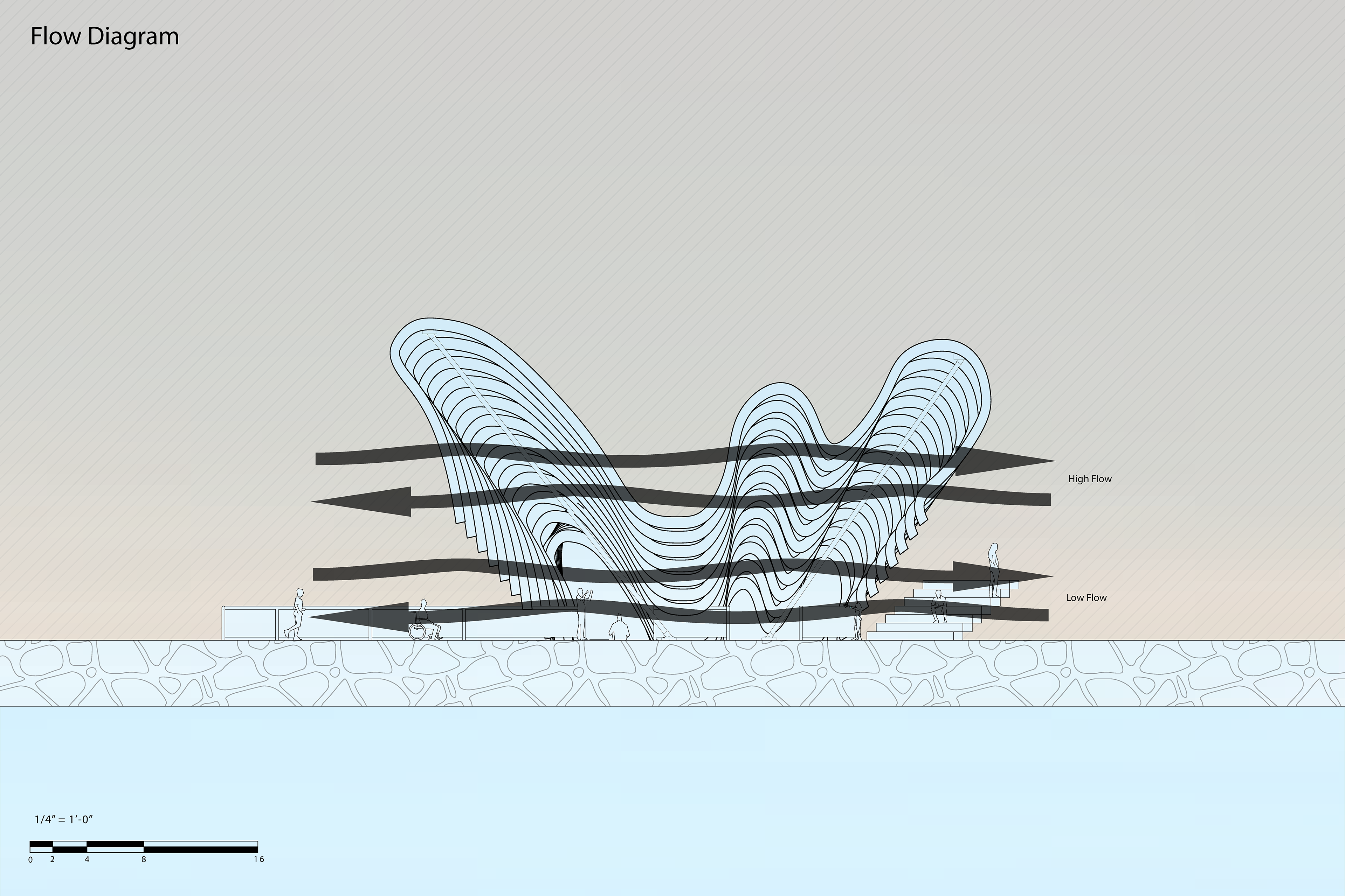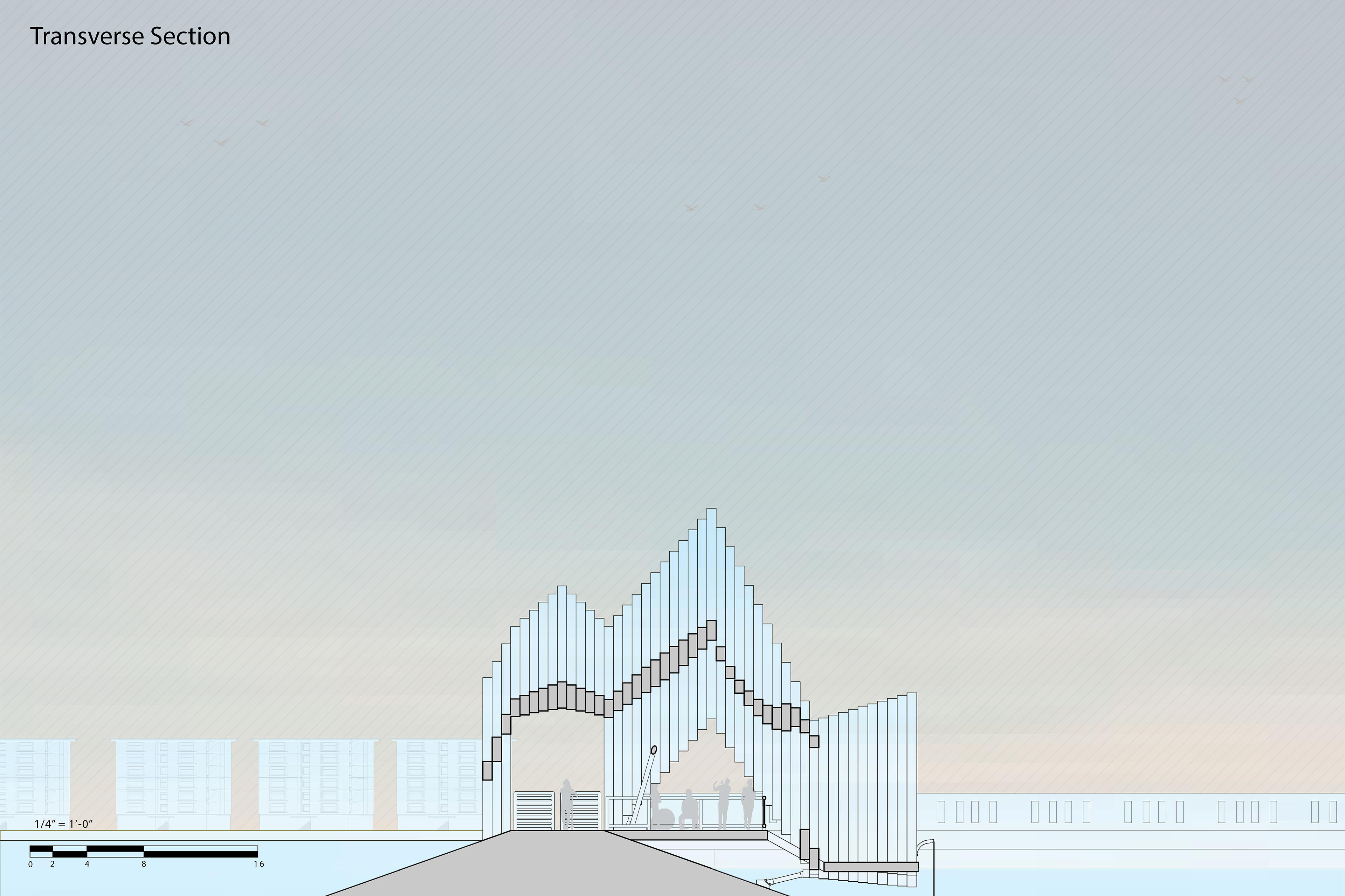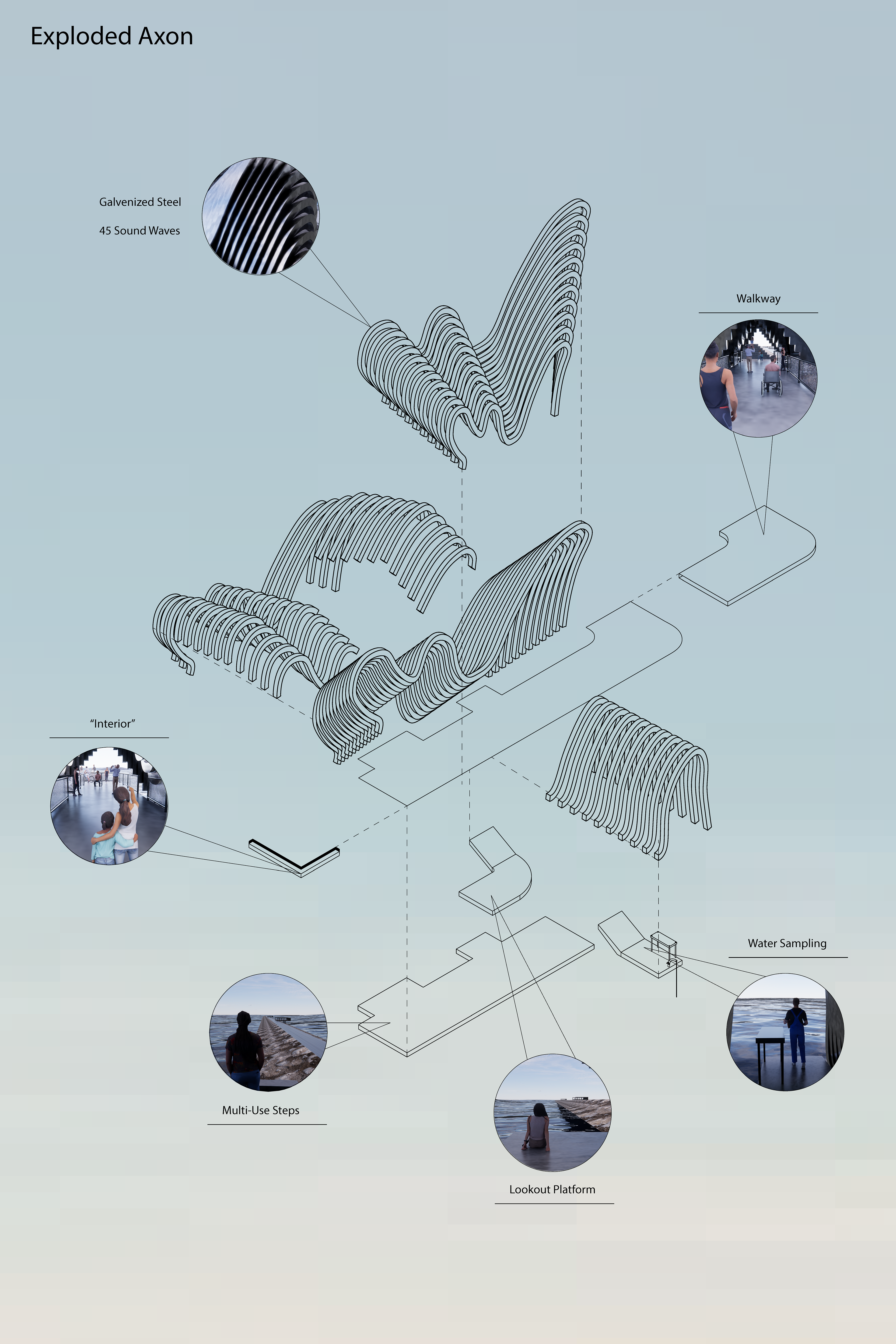 This project reimagines the existing jetty in Marina del Rey as an interactive public attraction that enhances the experience of the waterfront. Currently functioning as a simple pedestrian pathway, the design transforms the jetty into an engaging spatial journey that celebrates the site’s natural elements; water, wind, sounds, and expansive coastal views.